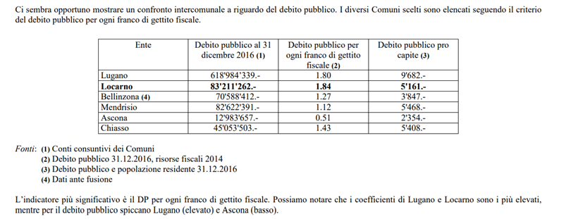 Nell’ottobre 1993 l’Ufficio cantonale di statistica, per la collana Aspetti statistici (“collana dedicata alla presentazione di analisi effettuate utilizzando la metodologia statistica”), pubblica il documento “Indici e finanze comunali”, uno studio del lic.oec. HSG Marco Bizzozero che, a proposito del Debito pubblico scrive: “la sua importanza va relativizzata, in quanto è una grandezza difficile da interpretare, ed eventuali paragoni con altri Comuni non sono sempre attendibili. Non è che uno e probabilmente non il più importante indice, e la necessità di essere visto in un contesto molto più vasto, con il supporto di altri indici è molto più grande che per altri.” (pagina 41)