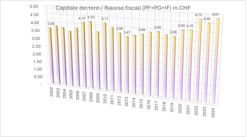 Negli ultimi tre (quattro) anni, quale ovvio riflesso degli ulteriori considerevoli investimenti effettuati soprattutto nell’edilizia scolastica, il valore è invece cresciuto in modo piuttosto sostenuto raggiungendo, nel 2024, CHF 4.81. Ad ogni buon conto, tra i due anni estremi, 2008 e 2024, la crescita è stata del 15% (con un patrimonio amministrativo cresciuto, nello stesso periodo, del 193%)