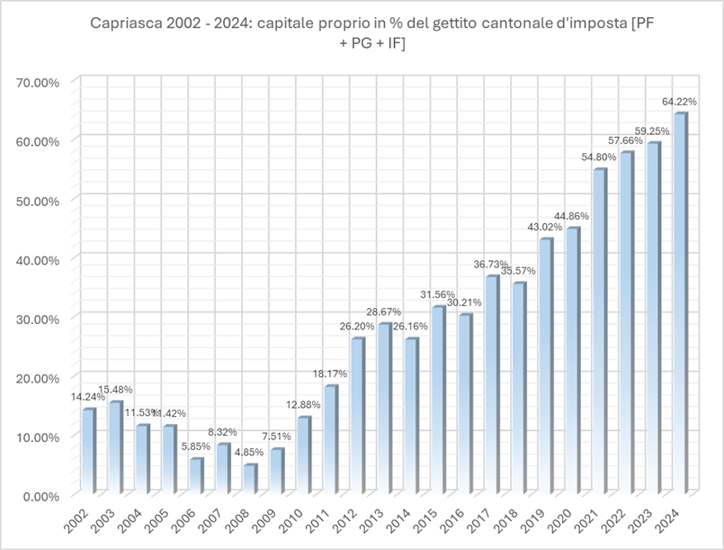 Nel consuntivo 2009, “in pratica il primo riferito alla nuova realtà di Capriasca” a pagina 21 il Municipio scrive: “…capitale proprio, che aumenterà pertanto a fr. 911’993.11, ossia l’8,28% delle risorse fiscali del Comune (imposte dirette persone fisiche e persone giuridiche, al 100%) …”